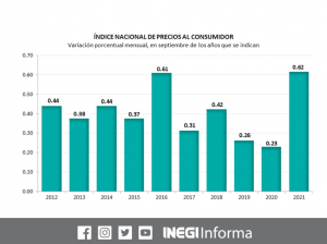 El Instituto Nacional de Estadística y Geografía (Inegi), informó este jueves que la inflación en México en el mes de septiembre fue de 0.62 por ciento. Con este resultado la inflación general anual fue de 6 por ciento. En el mismo mes de 2020 fue de 0.23 por ciento mensual y de 4.01 por ciento anual. Esto debido al aumento en el precio de los energéticos y algunos alimentos.