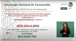“Muy importante que toda mujer embarazada debe esperar también, cuándo llegan las vacunas y cuándo se activan los puestos de vacunación en el municipio de residencia concurrentemente con los sitios que se están activando en todos los municipios, en todas las entidades federativas los puestos de vacunación para población de 50 a 59”.