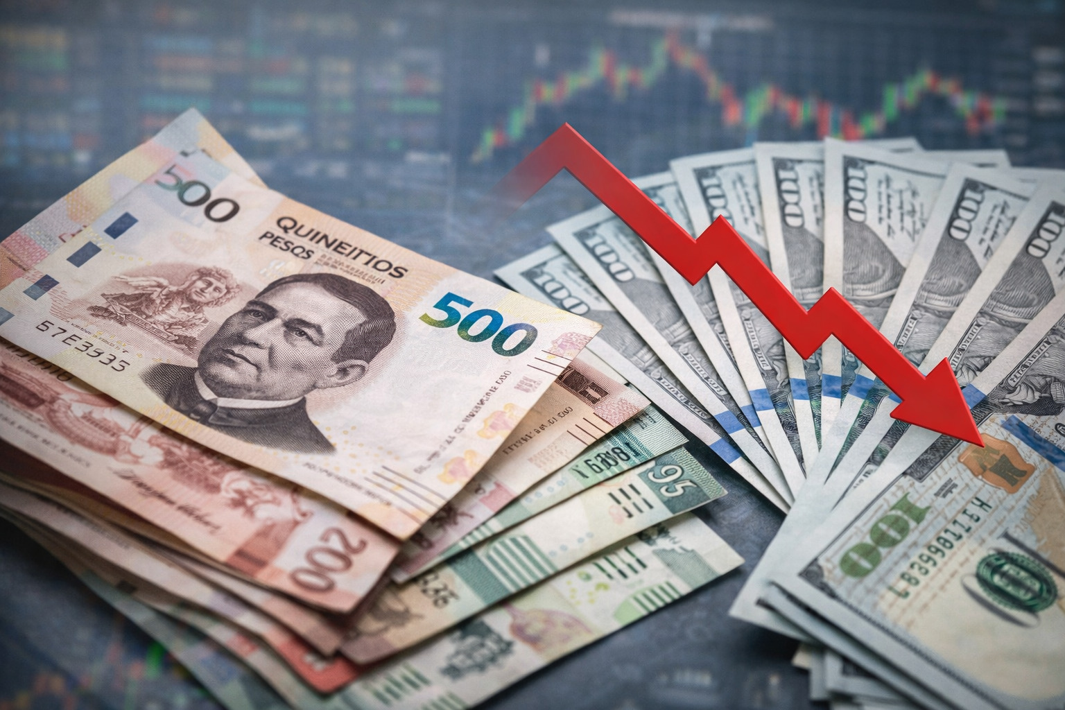 El peso mexicano inició la jornada con una apreciación frente al dólar, al cotizar alrededor de 17.20 unidades por billete verde en el mercado interbancario, mientras que en ventanillas bancarias el dólar se ofrece cerca de 17.65 pesos, de acuerdo con datos del sector financiero.