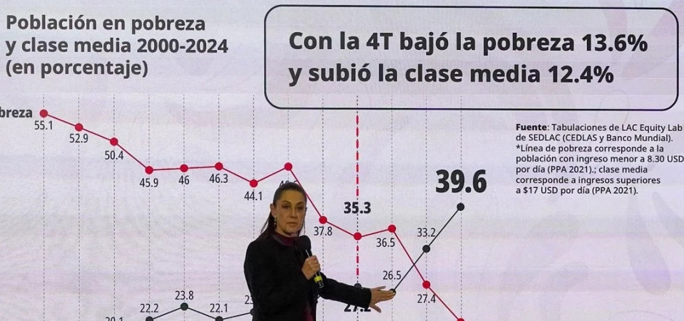 La presidenta Claudia Sheinbaum aseguró que, durante siete años de gobiernos de la llamada cuarta transformación, la población en situación de pobreza en México se redujo 13.6 por ciento, mientras que la clase media creció 12.4 por ciento, de acuerdo con cifras del Banco Mundial.